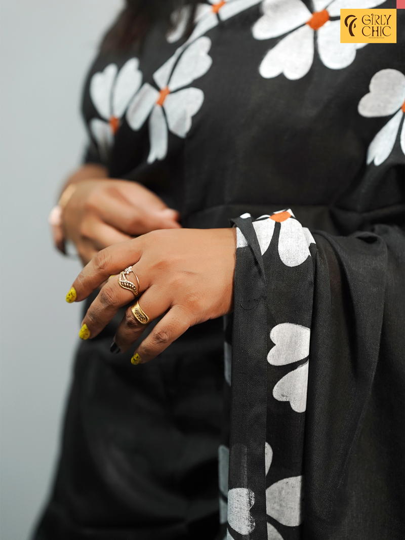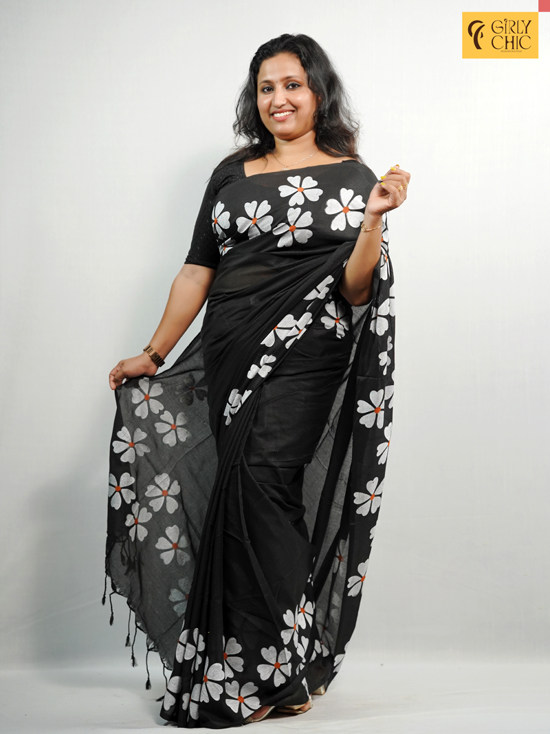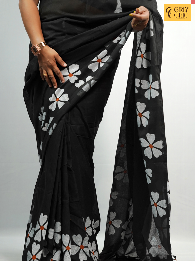Add a bold yet graceful touch to your ethnic wardrobe with this black cotton saree featuring Fabric-painted white floral motifs and vibrant orange accents. This elegant piece from Girly Chic showcases a striking contrast between the deep black base and the large white petal designs, offering a modern twist on traditional wear. Made from breathable cotton, this saree is perfect for all-day comfort – be it casual gatherings, cultural events, or summer outings.