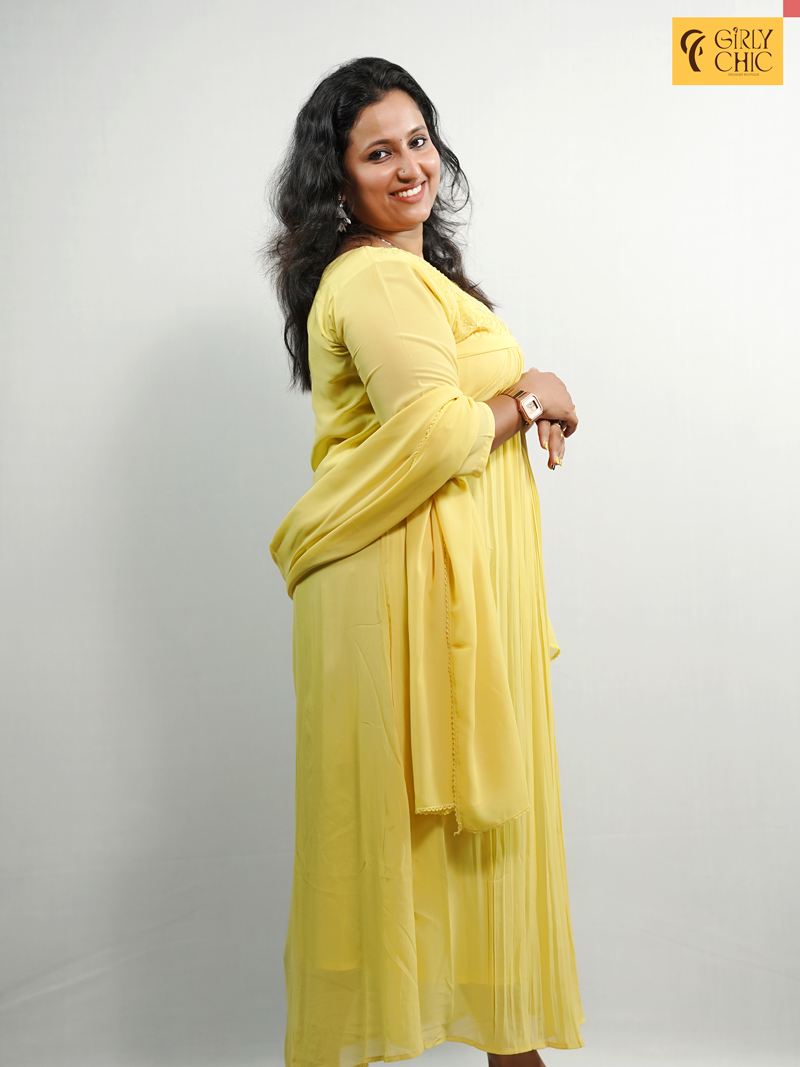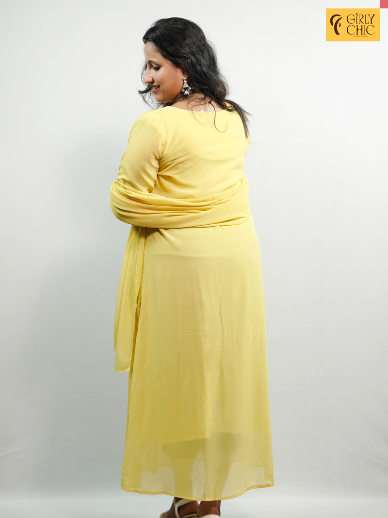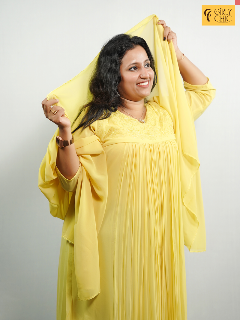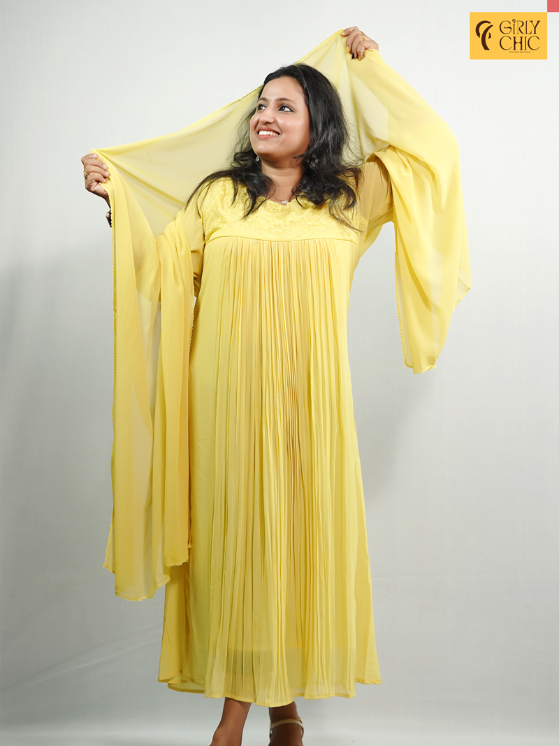 Radiate elegance in this blooming yellow georgette dress, designed with graceful pleats cascading down the front. The neckline is beautifully detailed with cut bead embroidery and delicate knot work, adding a subtle sparkle and artisanal charm. Its soft, flowy silhouette makes it a flattering and comfortable choice for both day and evening wear.