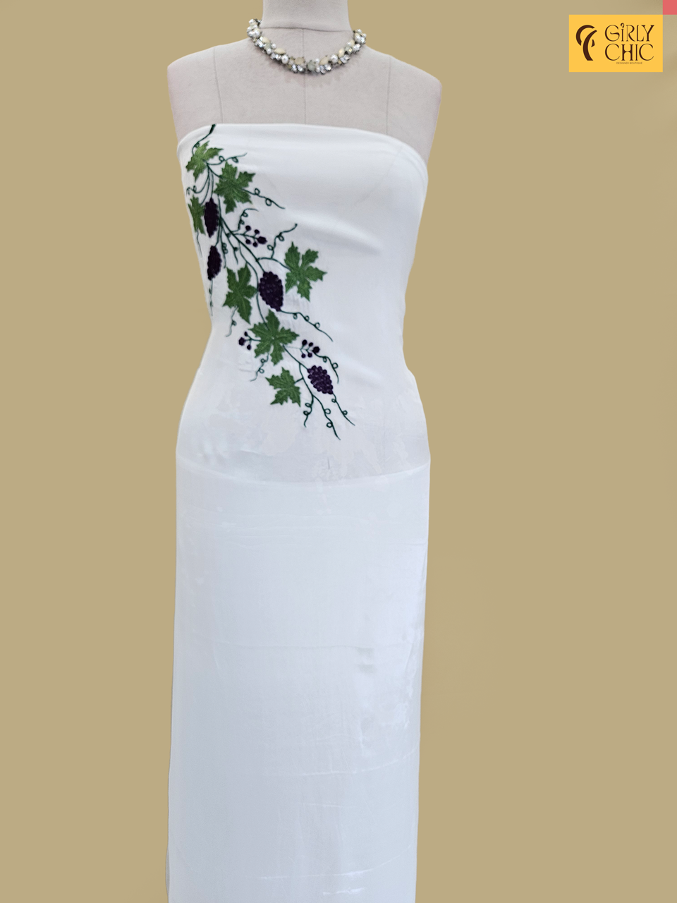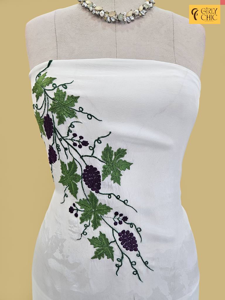 Crafted from smooth and lustrous silk, it comes in a graceful white tone with artistic vine embroidery in rich green and purple hues. Ideal for custom suits, gowns, or ethnic outfits — perfect for festive, bridal, and party wear.
