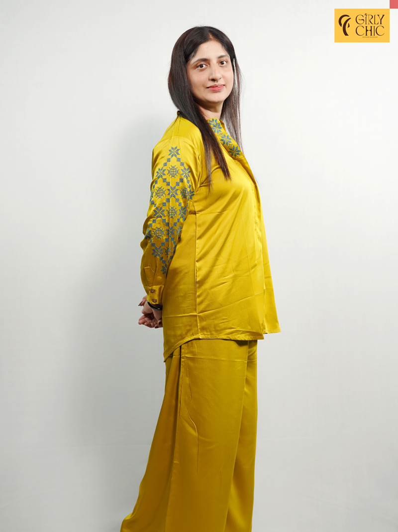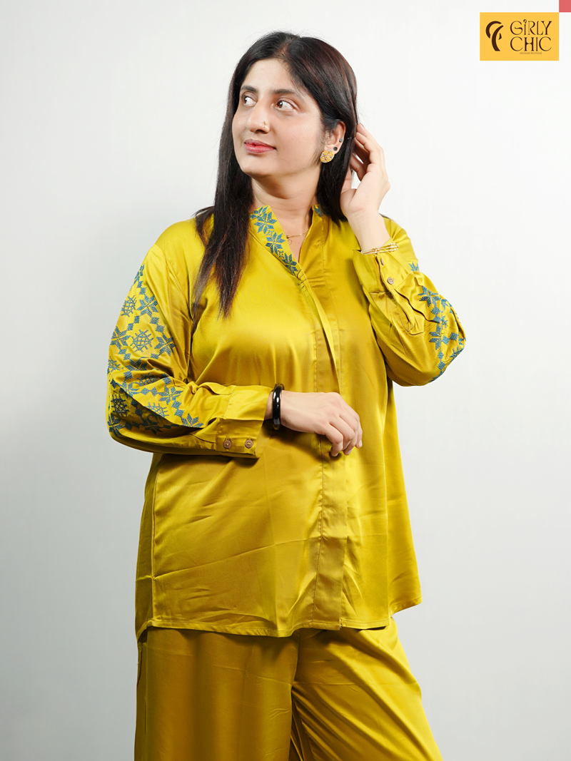 Elegant Cotton Satin Co-Ord Set with Machine Embroidered Neck & Sleeves