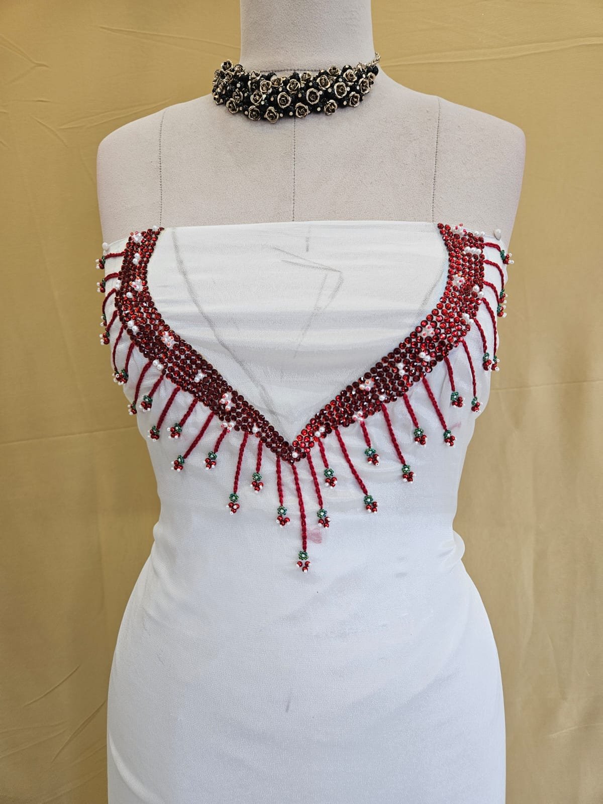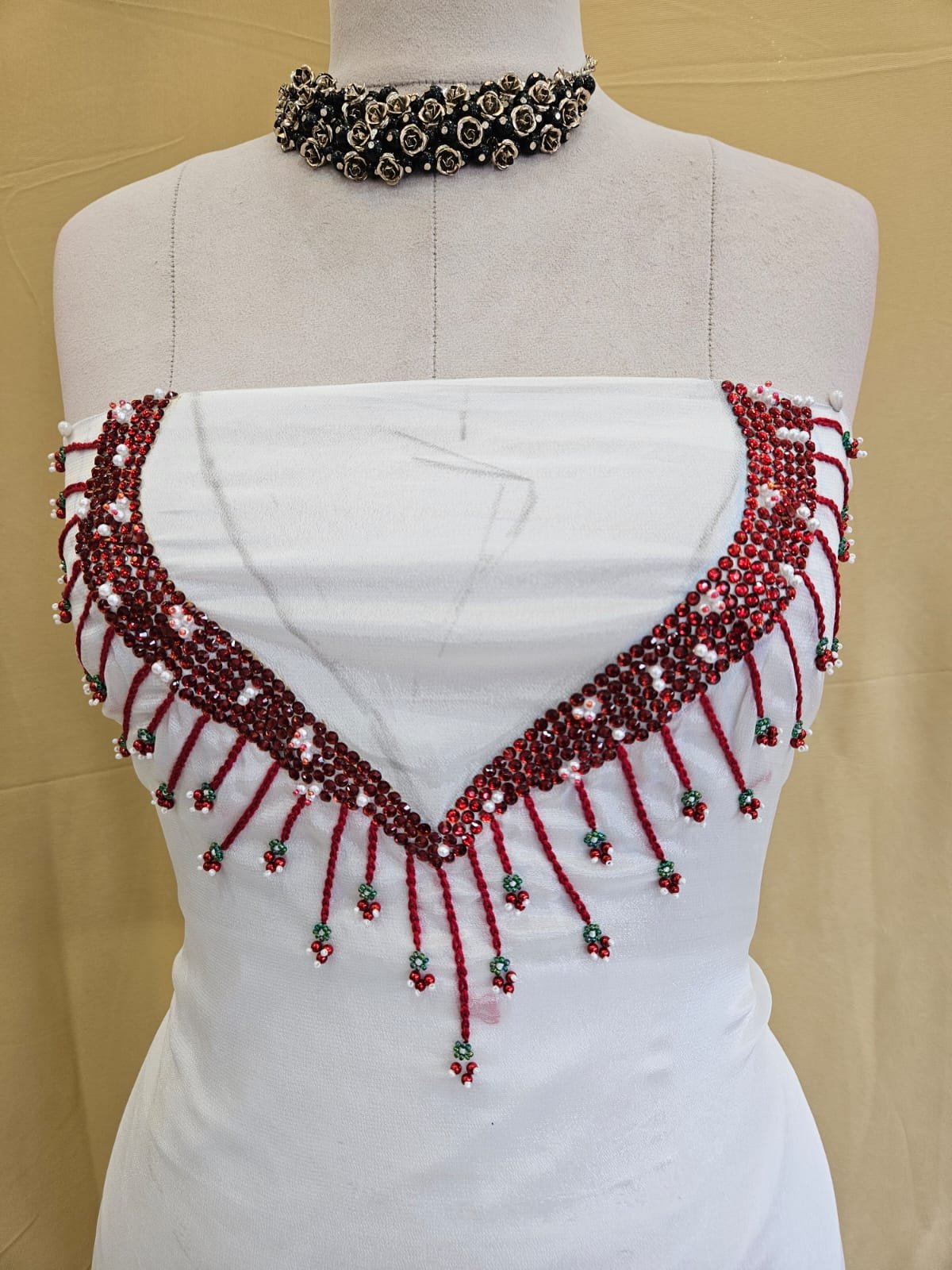 This premium crepe silk fabric combines soft luxury with refined craftsmanship. The highlight of this piece is its beautifully hand-embellished V-shaped neckline, adorned with intricate maroon beadwork and delicate detailing — a true statement of artistry and grace.
